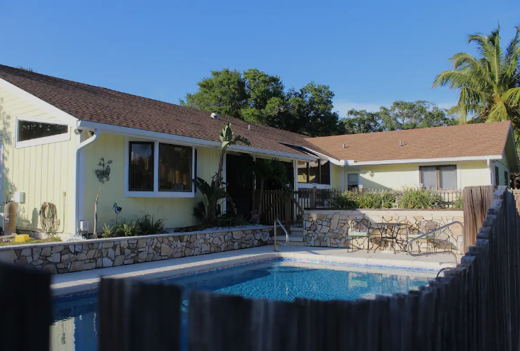 Guests can access three bedrooms, two bathrooms, an office, sun-room, living room, family room with wood burning fireplace and kitchen. There is also a screened in patio, outdoor patio and pool areas for guests